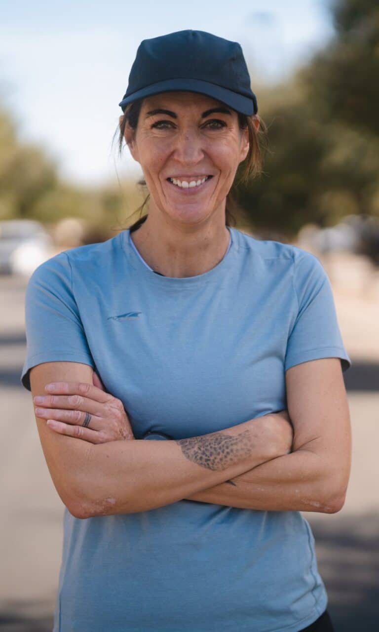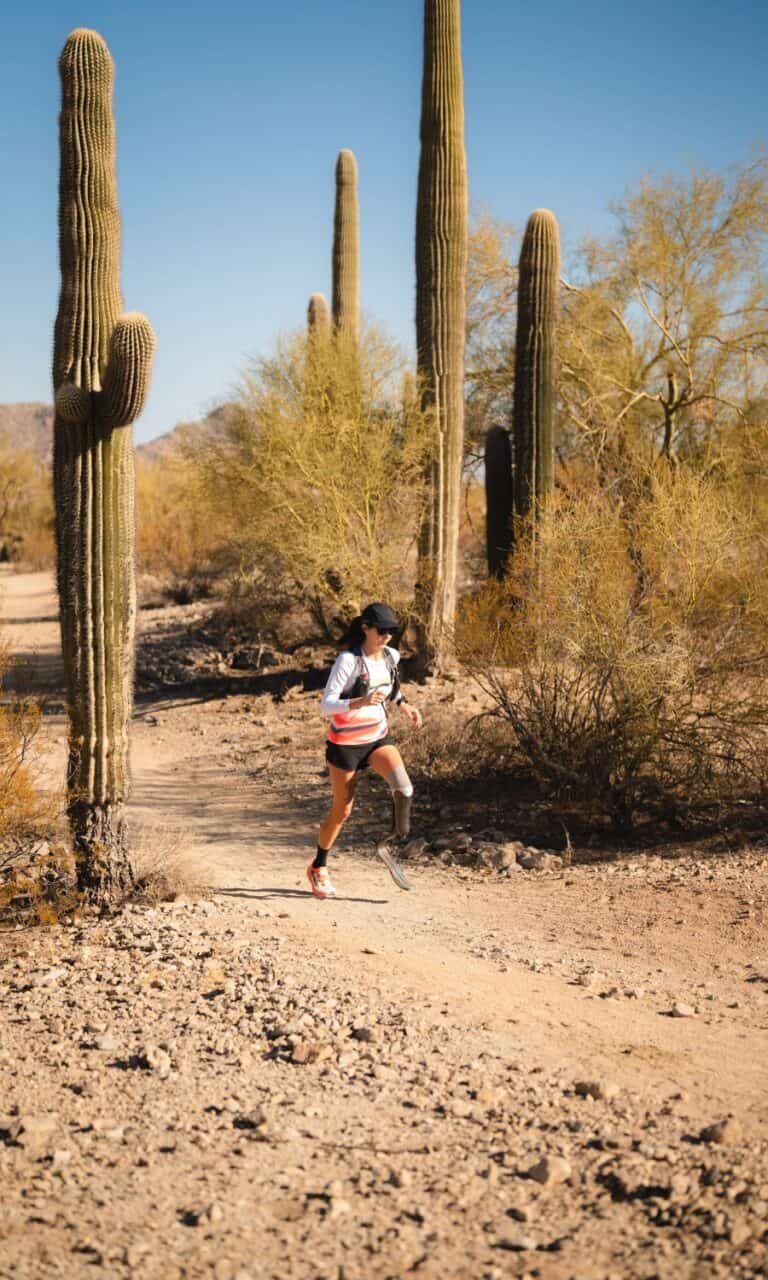 « Je ne m’habitue jamais au paysage, même si je viens tellement souvent ». Jacky nous accueille au milieu des monts rocheux et des cactus sous le soleil de 9 heures, dans le parc régional de San Tan Mountain. La chaleur sèche est déjà cuisante. Le désert change d’aspect suivant la température, il passe du vert quand c’est humide aux orangés arides lorsque c’est sec. On est sur son territoire, elle habite à 20 minutes. C’est entre autres ici qu’elle a couru de nombreux kilomètres des 104 marathons qu’elle a faits en 104 jours consécutifs en 2022, un record mondial qui lui appartient toujours. Elle avait alors amassé des fonds pour Amputee Blade Runners, qui fournit des prothèses de course qui ne sont pas couvertes par les assurances américaines – une cause qui lui est chère, naturellement. Au même titre que la recherche sur le cancer, pour laquelle elle a couru 250 demi-marathons en 250 jours, une autre prouesse, qui vit un peu dans l’ombre de son record du monde.