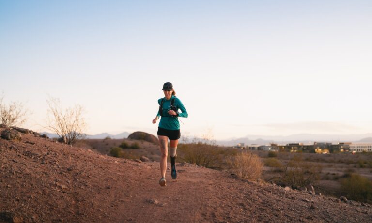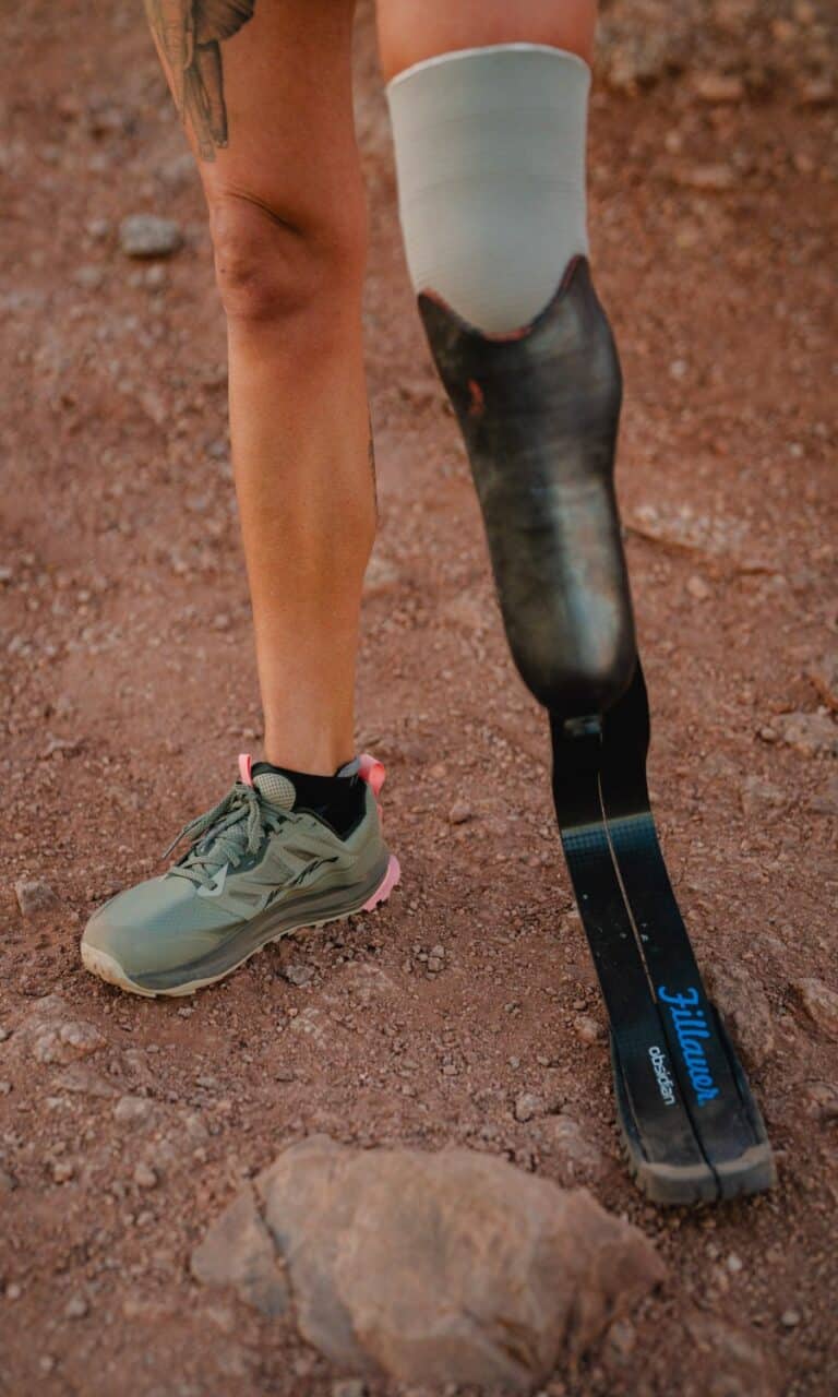Dans un premier temps, il lui fallait se procurer une prothèse sur mesure. Ensuite, il a fallu s’adapter, s’habituer à courir avec et à l’ajuster convenablement, pour que les hanches soient bien égales et que le rebond corresponde à la foulée. Aujourd’hui, la prothèse de Jacky est encore plus sophistiquée, mieux adaptée à la course sur sentier qu’elle préfère, et à ses défis uniques. « Il n’y a que mon pied droit qui me donne une vraie rétroaction tactile sur les surfaces », explique Jacky, qui ajoute que les chaussures Altra qu’elle utilise aident à cet égard, avec leur inclinaison nulle et leur largeur généreuse au niveau des orteils. Et pour ceux qui se demandent : oui, elle utilise les chaussures gauches, sur sa prothèse de tous les jours.
