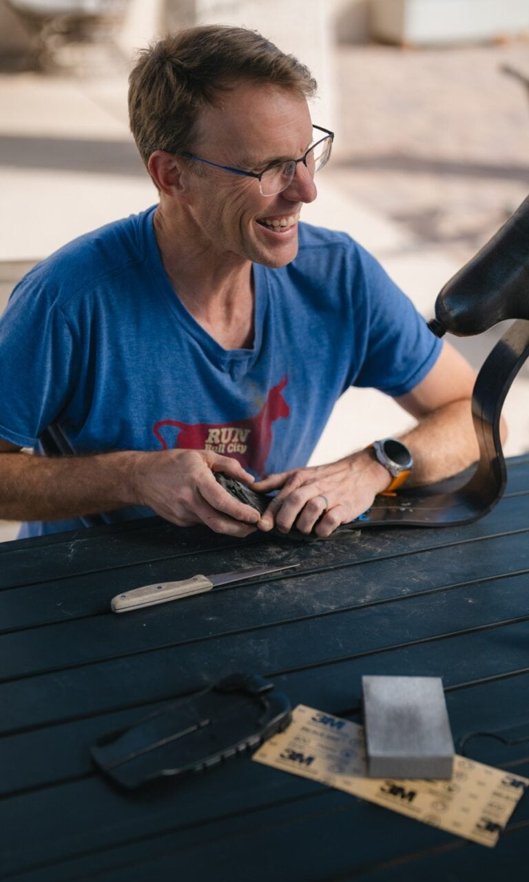 Jacky est phoenixoise d’adoption : née en Afrique du sud, elle a habité aux Pays-Bas, au Royaume-Uni et en Caroline du Nord avant de s’établir en Arizona, attirée par le climat qui ressemble davantage à celui de sa terre natale. Elle a deux ados, et elle est mariée depuis 27 ans à celui qui est aujourd’hui aussi son coach, et son technicien : c’est Edwin qui ajuste minutieusement sa prothèse de course et qui change la semelle en dessous, à tous les 800 kilomètres.